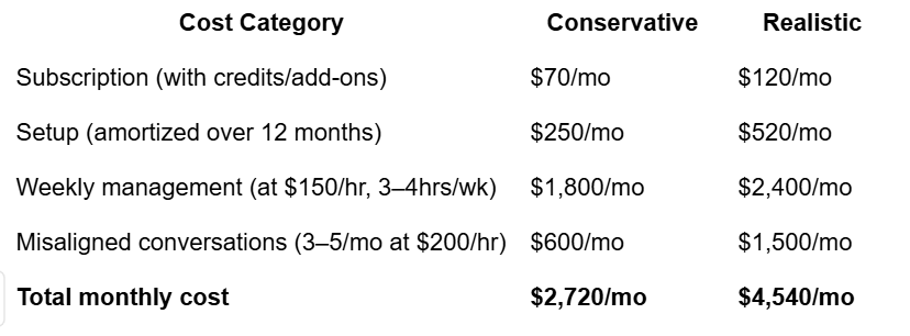 Realistic subscription cost for a solo consultant using the tool properly: $70–$120/month.